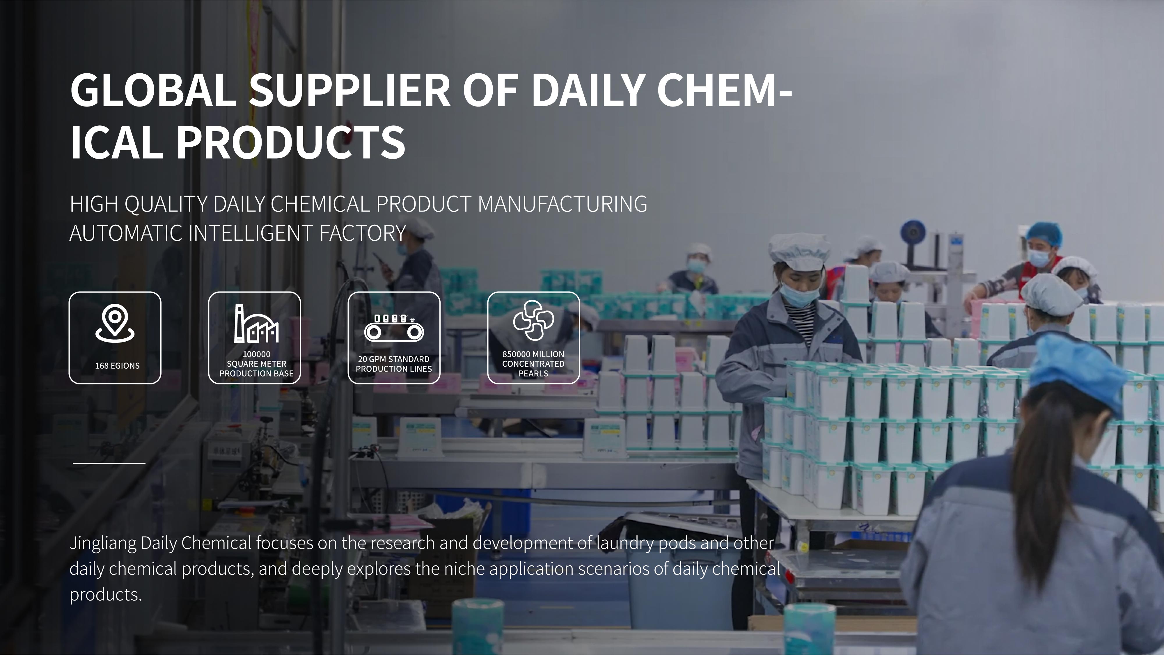 Foshan Jingliang Daily Chemical Products Co.,Ltd.(JL), established in 2019, is a daily chemical enterprise dedicated to building China's largest water-soluble packaging production base. Jingliang Daily Chemical focuses on water-soluble packaging production, specializing in the development and production of laundry pods, hand soap pods, dishwasher pods, foot bath pods, and other pod-type products. Currently, it is expanding its production to include laundry sheets, laundry detergent, and dishwashing tablets.
