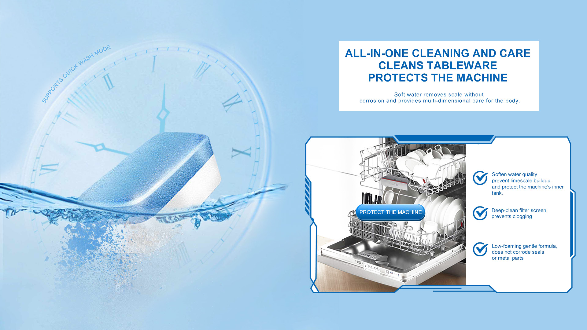 When in contact with water, the dishwashing block releases active ingredients, which, combined with the cleaning power of high-temperature water, effectively removes bacteria adhering to dishes and plates.